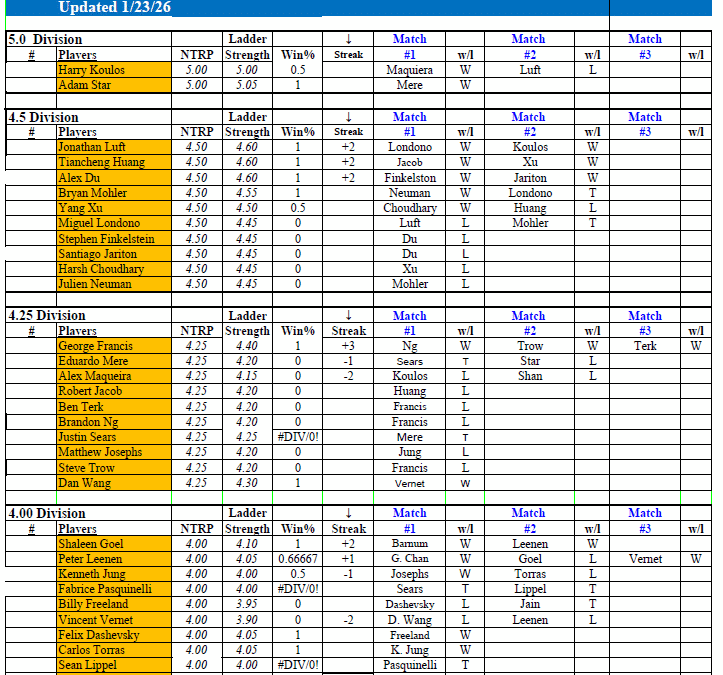 This year round league is divided into three seasons (Fall, Winter, Spring/Summer) each consisting of 12- 14 weeks plus two weeks for Playoffs. The Advanced Singles League is ladder based, using several criteria; NTRP, Points (+/- .05 for each win/loss), Win Percentage (wins/total), and Current Streak. Players are ranked this way to encourage more match play and rewards for each win. Depending on your results, you can be moved up or down between divisions. You’ll play an assortment of matches, including your division, as well as ones just above and below it. Matches are played Monday-Friday.